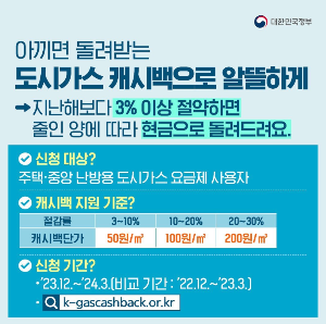 도시가스 절약 캐시백 제도란, 주택난방용 도시가스 요금제를 사용하는 분들을 대상으로 운영하는 제도입니다. 12월부터 3월 동안 전년도보다 3% 이상 도시가스 사용량을 줄였다면, 줄인 양에 따라 가스 요금의 30% 한도 내에서 현금으로 다시 되돌려줍니다.