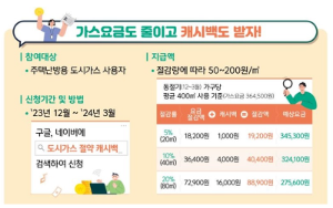 2023년 1월부터 4월까지 발행된 도시가스 요금 고지서와 2024년 1월부터 4월까지 발행된 도시가스 요금 고지서를 비교해서 절감률 별로 차등 캐시백을 지급합니다. 지급단가도 절감률이 높을수록 증가합니다.